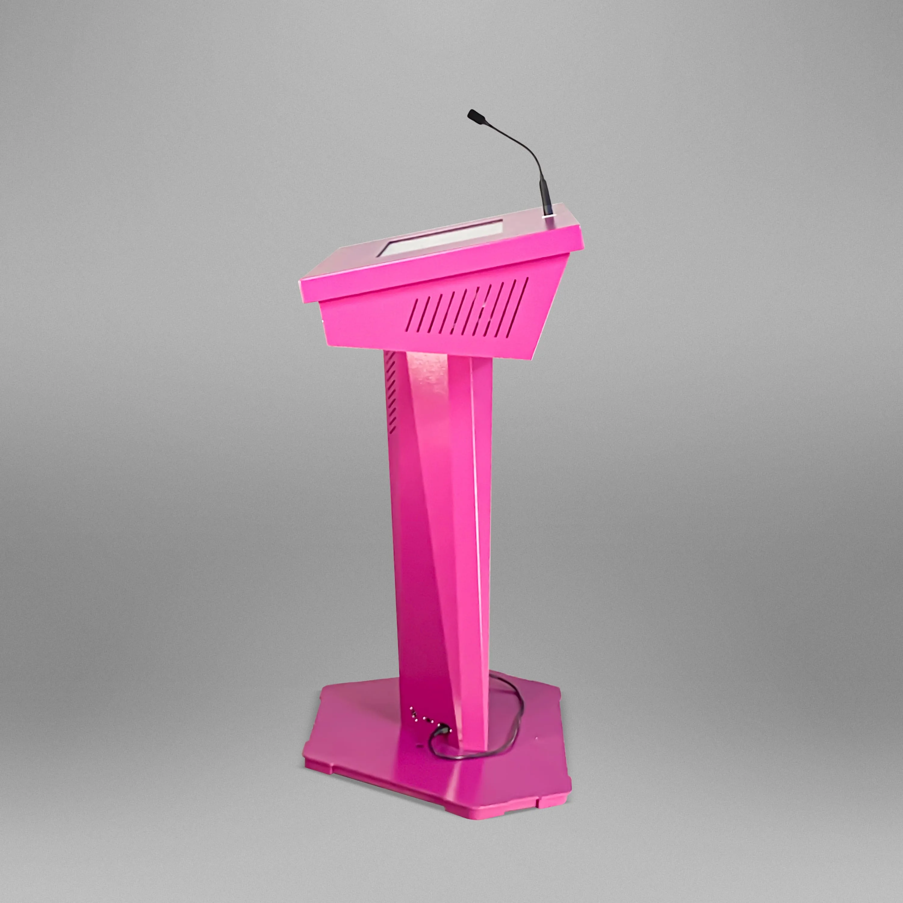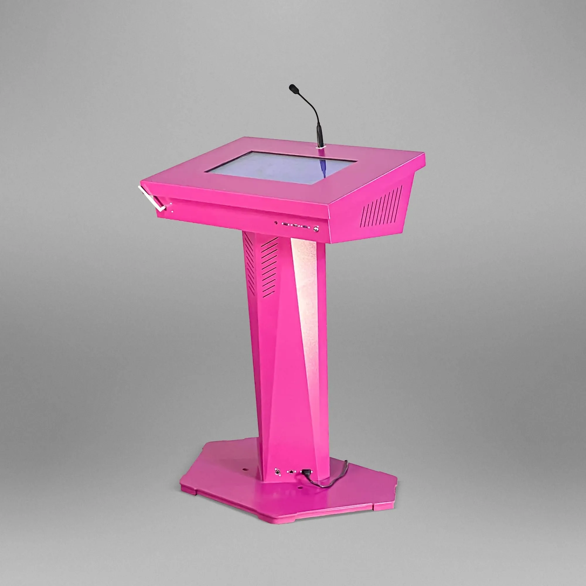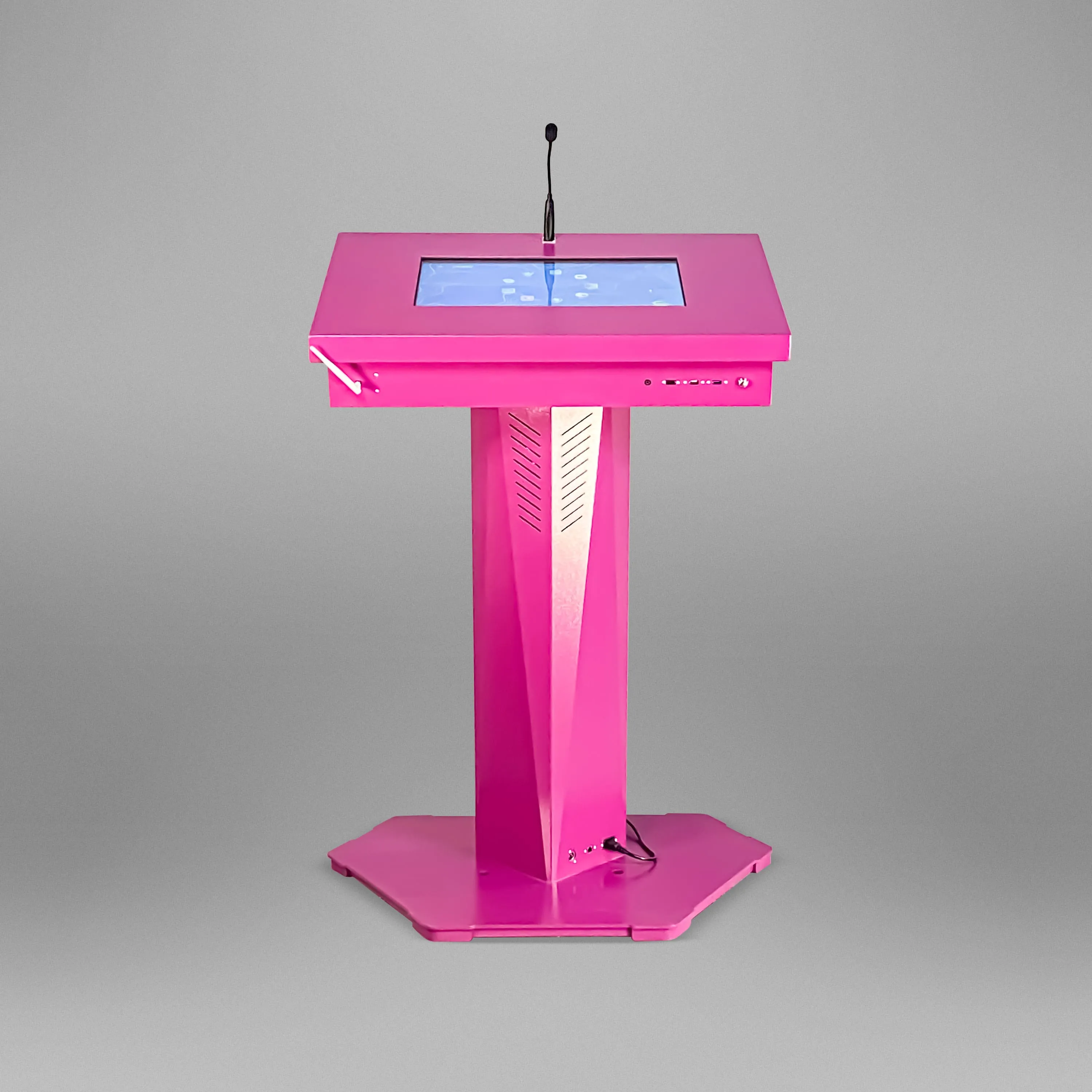 Футуристический, запоминающийся дизайн и высокотехнологичная начинка – вот главные особенности этой интерактивной трибуны. Мы предусмотрели все, что нужно для выступлений – микрофоны, усилитель звука, необходимые разъемы для подключения оборудования, большой сенсорный дисплей, возможность выводить информацию на большой экран.Опционально возможно индивидуальная разработка: