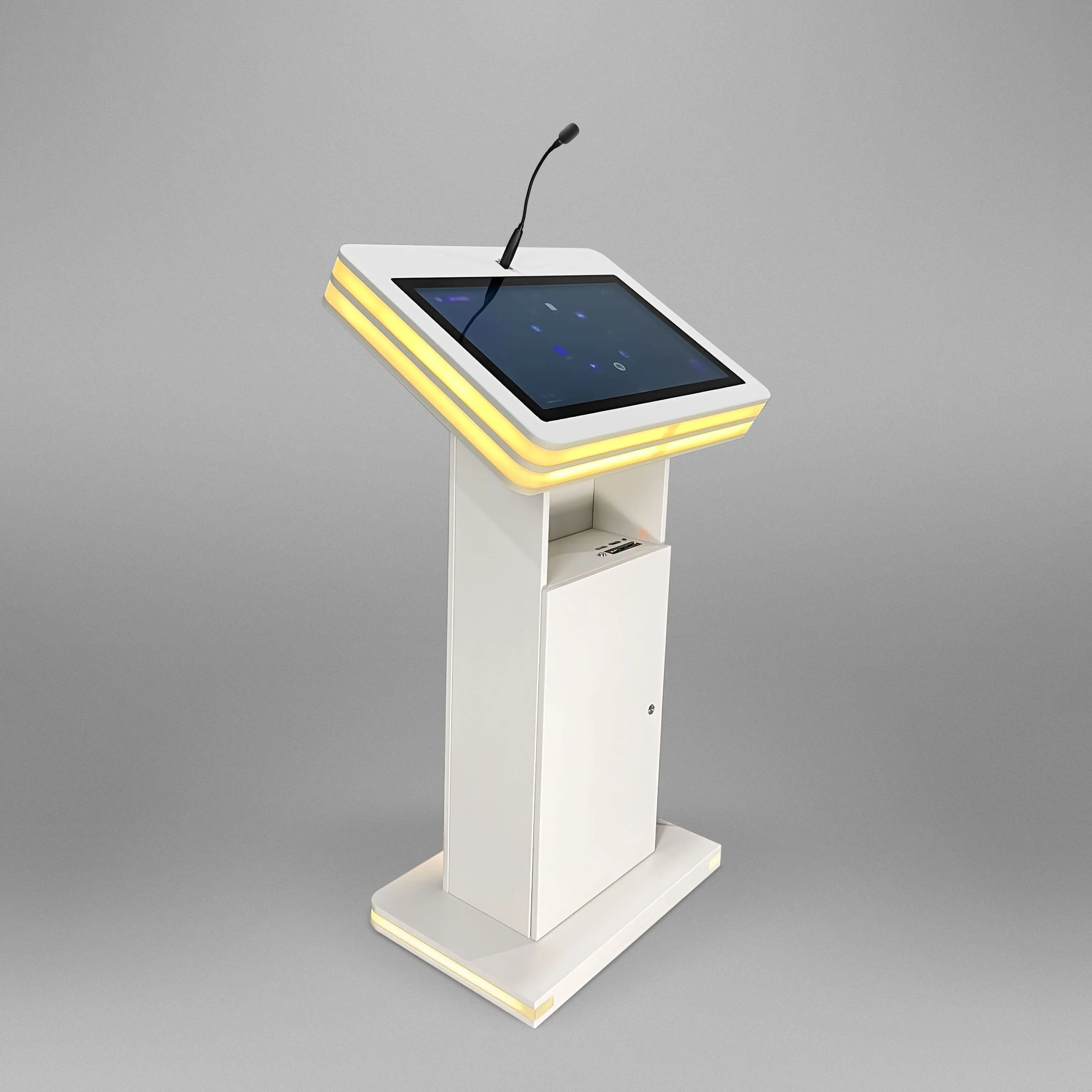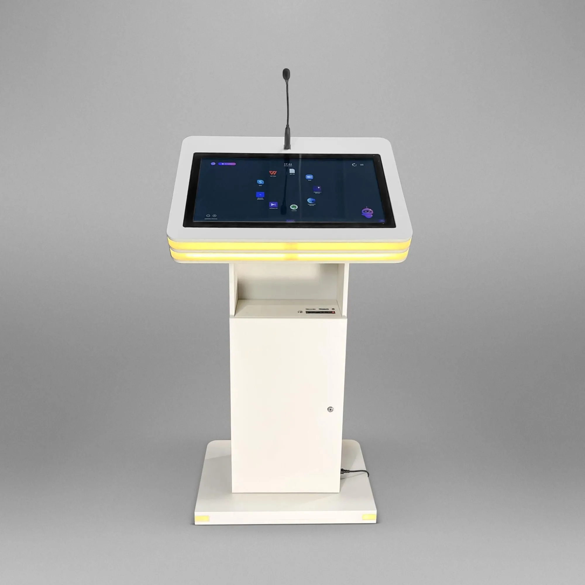 Одна из самых стильных моделей в нашей линейке интерактивных трибун украсит любой фестиваль, конференцию или бизнес-форум. Мы встроили в трибуну большой яркий дисплей с технологией мультитач, микрофоны, разъемы для дополнительной аппаратуры. WHITE STRIPES – отличный помощник для спикеров или лекторов в вузах.Опционально: