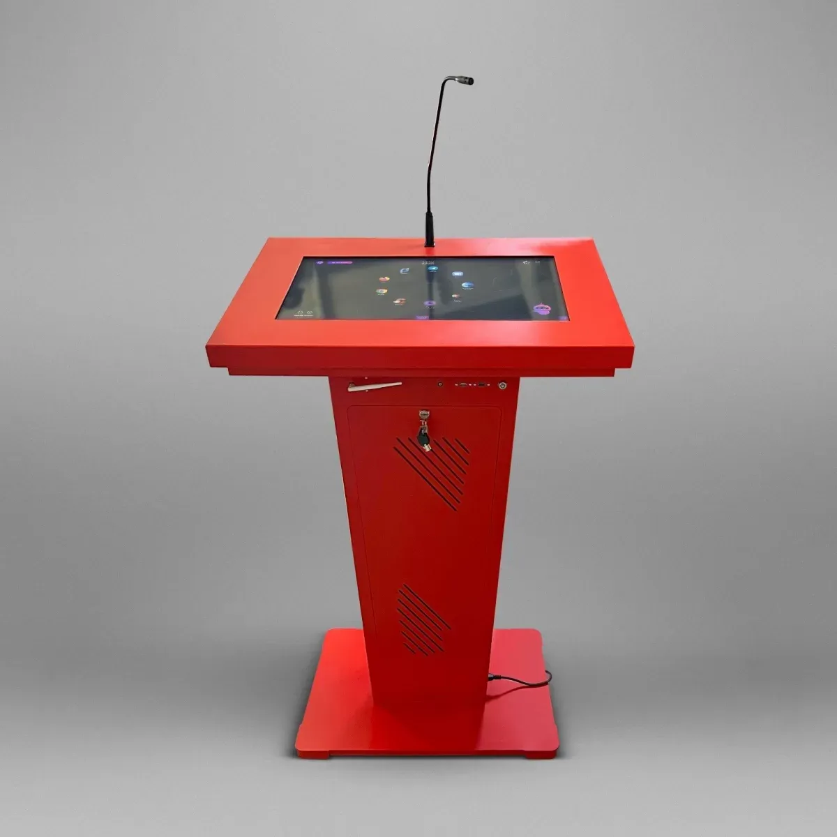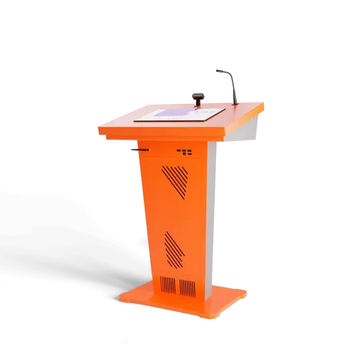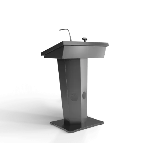 Эта интерактивная трибуна удивляет своим футуристическим и запоминающимся дизайном, а также имеет передовую техническую начинку. В ней предусмотрены все необходимые элементы для успешных выступлений: микрофоны, колонки, усилитель звука, разъемы для подключения оборудования. Также она оснащена большим сенсорным дисплеем и возможностью вывода информации на большой экран.Опционально возможно индивидуальная разработка: