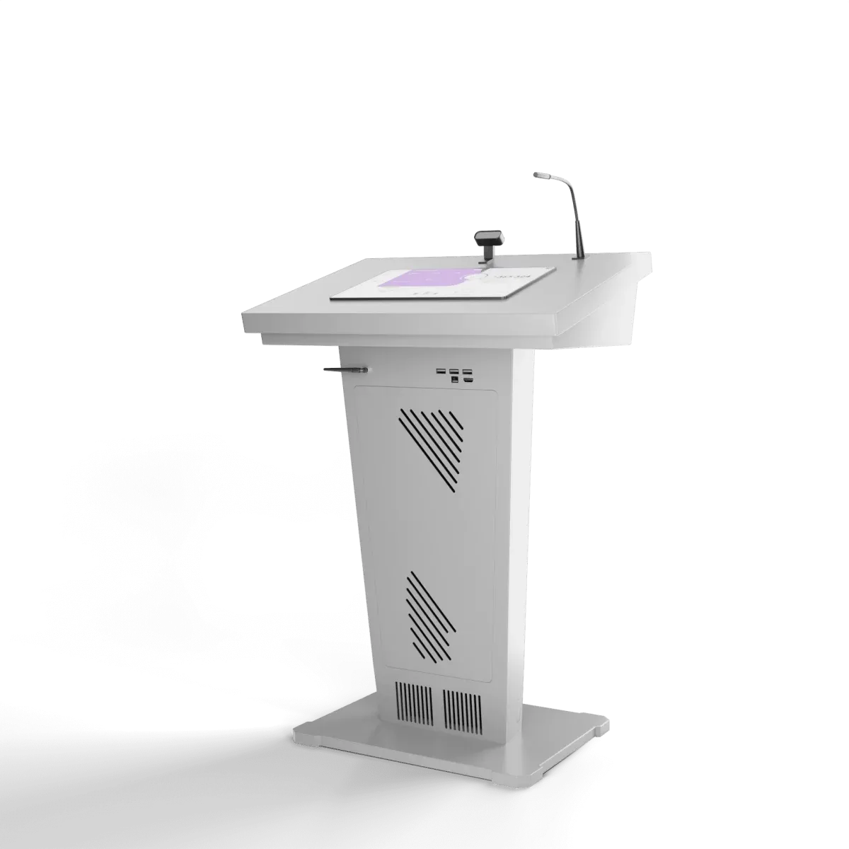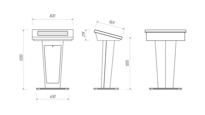 Эта интерактивная трибуна удивляет своим футуристическим и запоминающимся дизайном, а также имеет передовую техническую начинку. В ней предусмотрены все необходимые элементы для успешных выступлений: микрофоны, колонки, усилитель звука, разъемы для подключения оборудования. Также она оснащена большим сенсорным дисплеем и возможностью вывода информации на большой экран.Опционально возможно индивидуальная разработка: