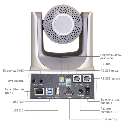| Интерфейсы управления | 1xRS-232 IN: 8pin Min DIN, максимальная дистанция: 30 м, Протоколы: VISCA/Pelco-D/Pelco-P 1xRS-232 OUT: 8pin Min DIN, максимальная дистанция: 30 м, Протокол: VISCA 1xRS-485: 2pin pluggable connectors, максимальная дистанция: 1200 м, Протоколы: VISCA/Pelco-D/Pelco-P |