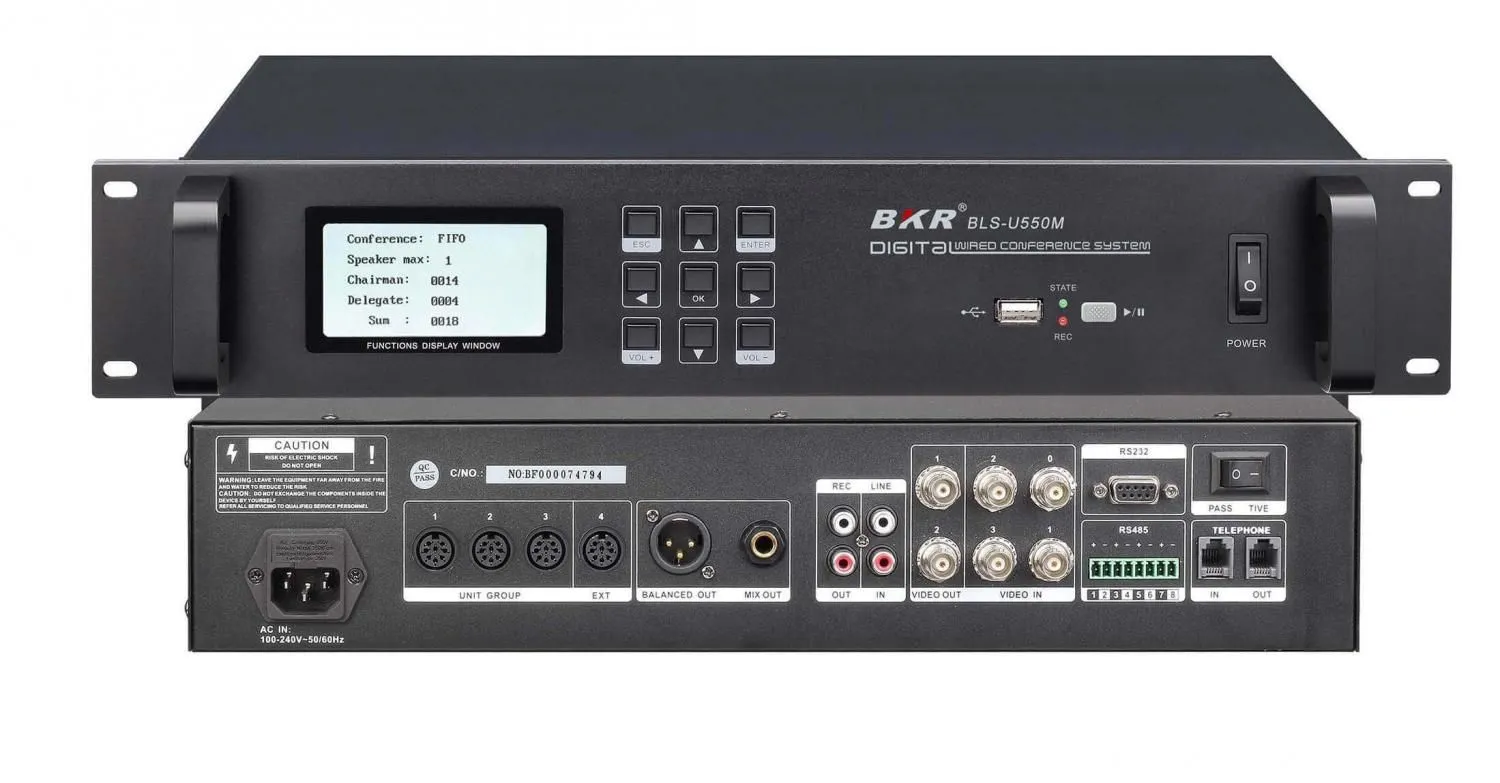 Блок управления clevermic BKR BLS-U550M с функцией видео-слежения за говорящим участником конференции, позволяет проводить голосование и производить запись мероприятия на USB флэш накопитель объемом до 16 ГБ. Устройство позволяет управлять голосовыми режимами и количеством одновременно говорящих участников, имеет функцию обратной связи, включающуюся при нажатии на задней панели клавиши с функцией включения и выключения.