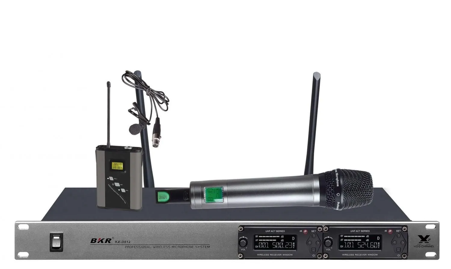 Микрофонная радиосистема с ручным и петличным микрофоном. 2 канальная регулируемая частота. ЖК-экран показывает рабочее состояние центрального блока управления и микрофонов. Энергопотребление 80мА. Питание происходит от 2х батареек типа АА 1.5 В, что обеспечивает беспрерывную работу в течении 8 часов. Петличный микрофон имеет встроенный литиевый аккумулятор, способный работать до 8 часов. Петличный микрофон выполнен из пластика, ручной микрофон выполнен из металла. Рабочее расстояние: 50-80 м.