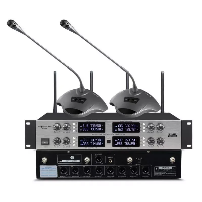 - Потребление микрофонных пультов составляет 80 мА. Используется AA 1.5 В × 2 источник питания, работа до 8 часов