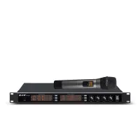 4 канала. Регулируемая частота. Каждый канал имеет 100 дополнительных частот, увеличивая/уменьшая на 0,25 МГц. ЖК-экраны показывают рабочее состояние на приемнике и излучателе. Потребляемая мощность микрофона составляет 80 мА. Источник питания микрофона — две 1.5В АА батареи (при полном заряде батареи среднее время непрерывной работы микрофона до 5 часов). Металлический корпус микрофона. Рабочее расстояние: 50 - 70 метров.
