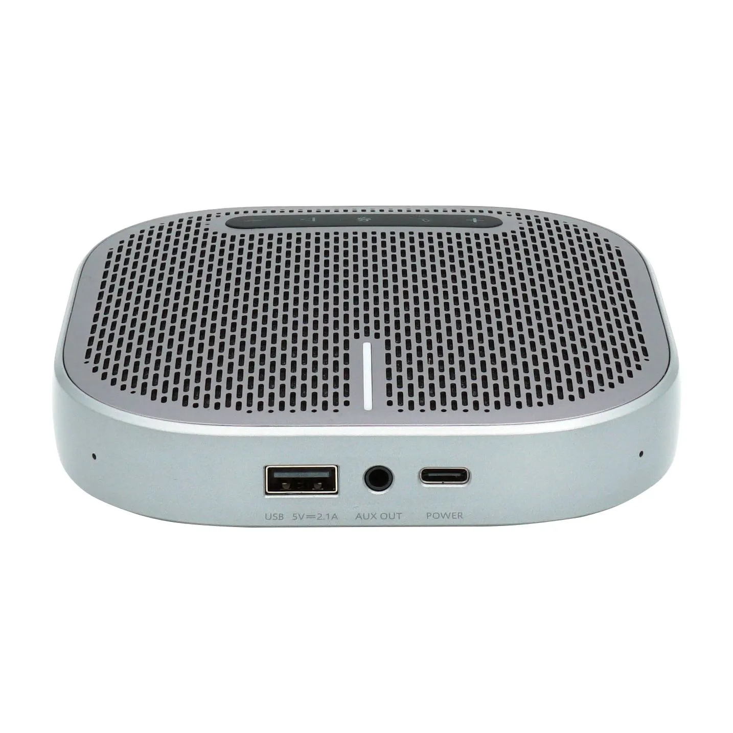 Спикерфон с встроенным массивом из 4 микрофонов, всенаправленный захват на 360°, полнодуплексная аудиотехнология. Поддержка эхоподавления (AEC), шумоподавления (ANS) и функции автоматического усиления (AGC). Динамики High Fidelity и адаптивная технология усиления высокой четкости обеспечивают высокое качество звука. Его также можно использовать в качестве динамика Bluetooth, просто подключив его к телефону или компьютеру через Bluetooth. Встроенная батарея большой емкости может дать мобильному телефону и другому оборудованию аварийное электропитание.