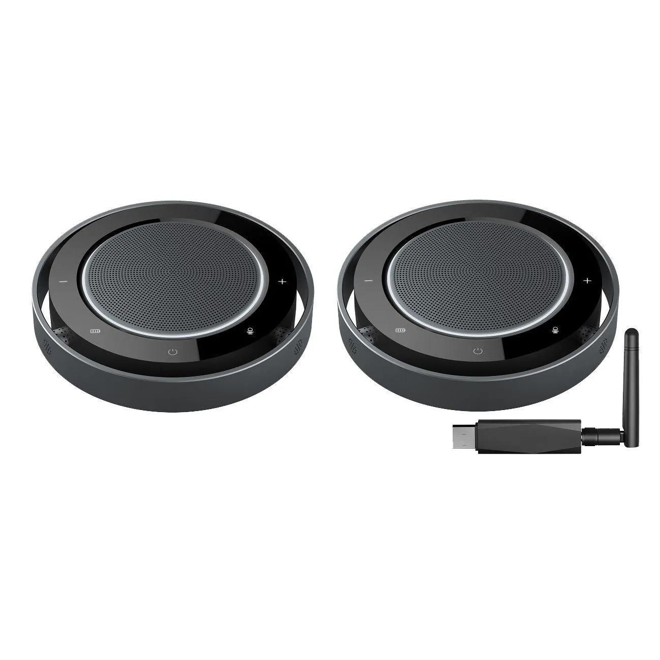 Комплект из двух беспроводных спикерфонов для конференцсвязи с 360° и 12 м радиусом захвата, а также USB подключением беспроводного адаптера к компьютеру.