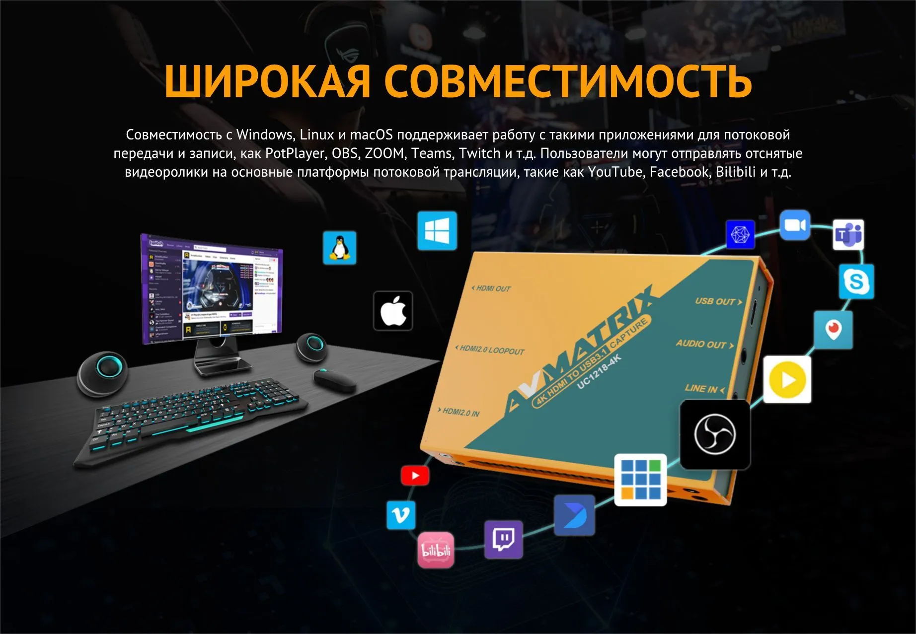 - Совместимость с ПО OBS, ZOOM, Teams, Twitch, Vmix, и пр.